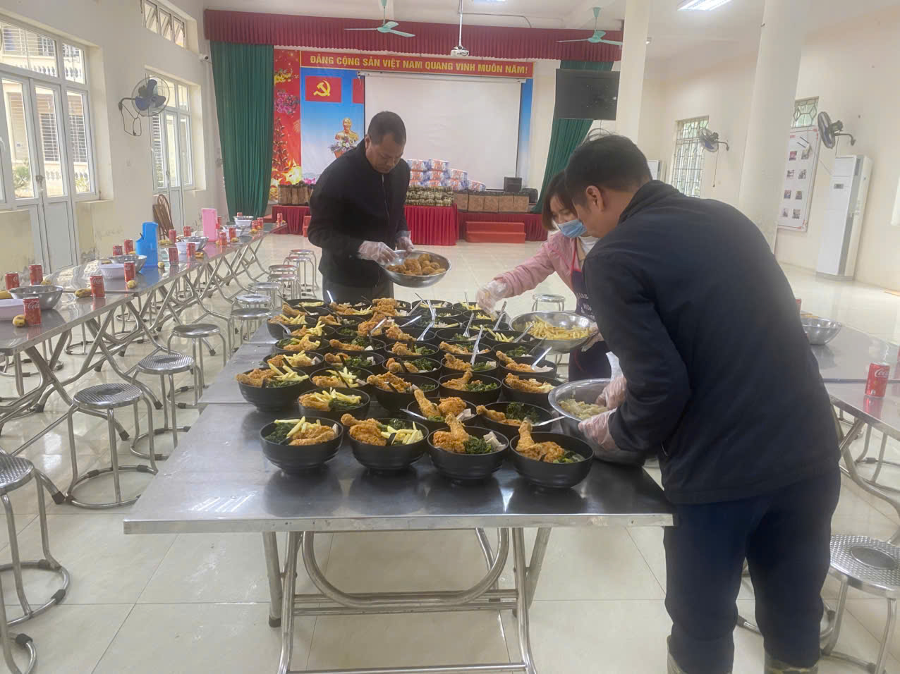 Ảnh 1: Cán bộ Trung tâm chuẩn bị suất ăn cho nạn nhân nhân dịp 23 tháng Chạp