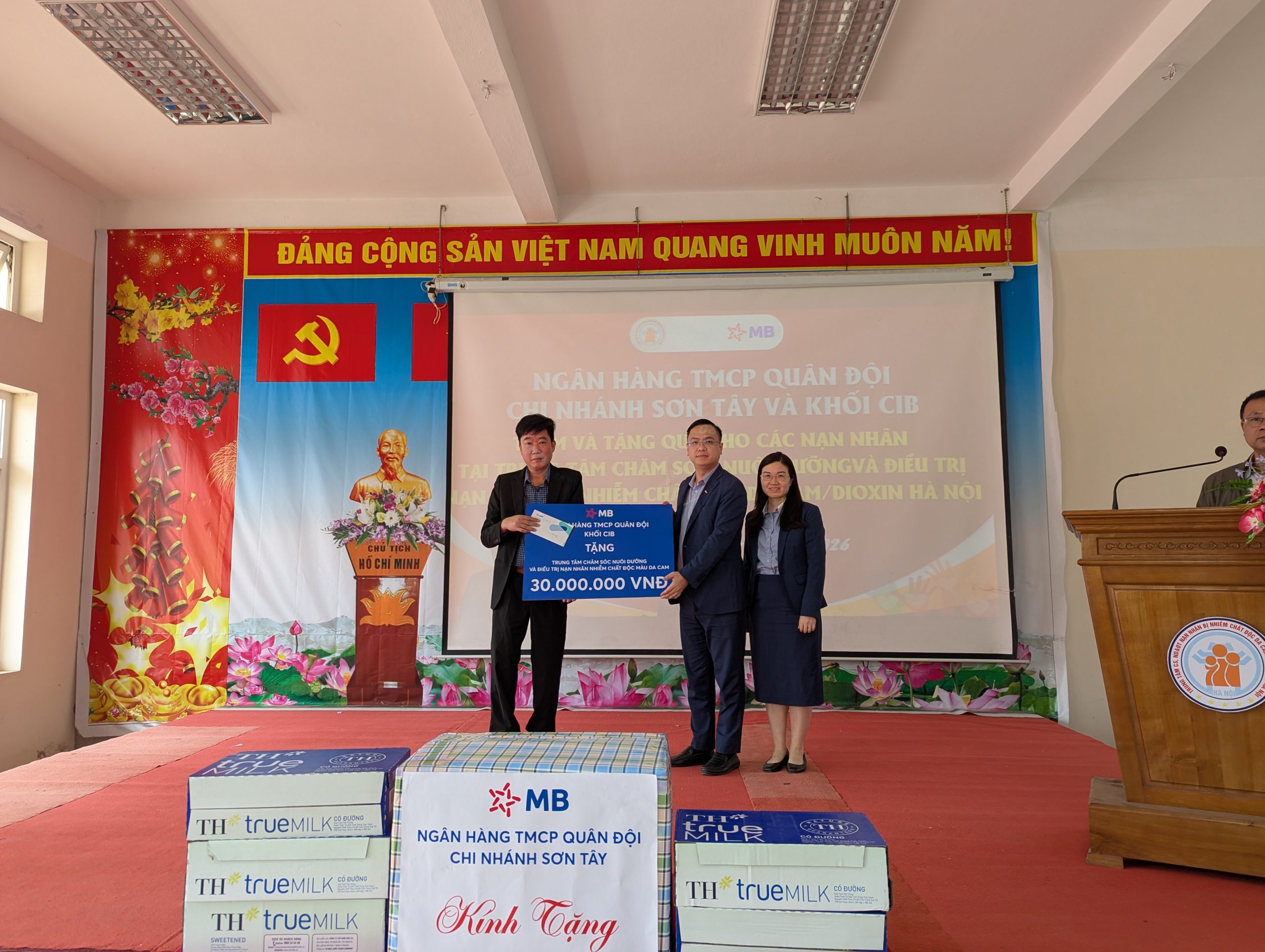 Trong khuôn khổ chương trình, đại diện đoàn thiện nguyện đã trao tặng các phần quà cho Trung tâm. Cụ thể, Ngân hàng TMCP Quân đội – Chi nhánh Sơn Tây trao tặng hiện vật trị giá 10.000.000 đồng cùng nhiều phần quà Tết; Ngân hàng TMCP Quân đội – Khối CIB trao tặng 30.000.000 đồng tiền mặt, góp phần hỗ trợ Trung tâm trong công tác chăm sóc, nuôi dưỡng các nạn nhân.