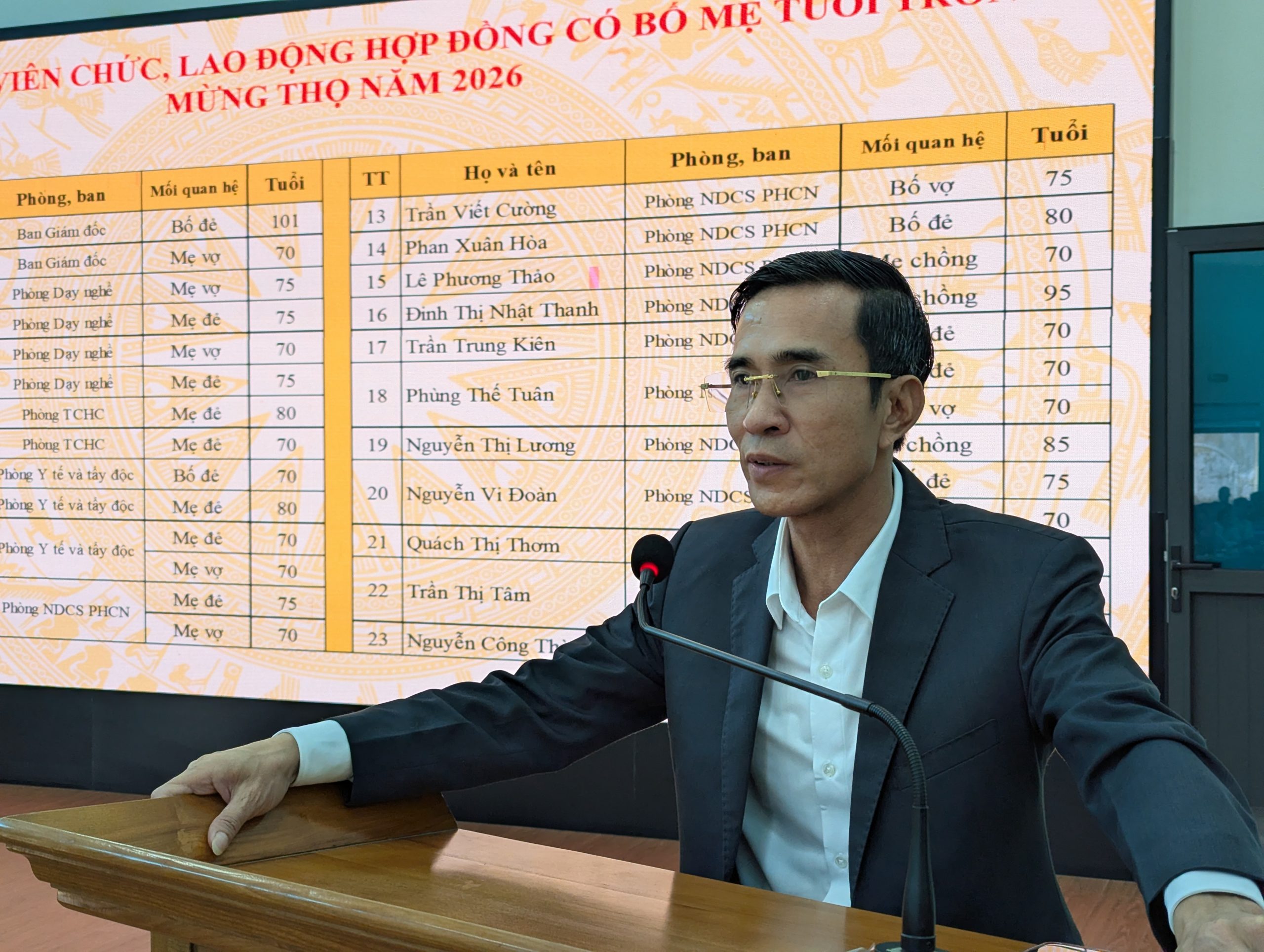 Cũng nhân dịp đầu xuân năm mới, đồng chí Hoàng Văn Luật thay mặt Ban Giám đốc Trung tâm gửi những lời chúc, phần quà mừng thọ cho các thân nhân của viên chức, người lao động có tuổi tròn trong năm 2026. Đây là hoạt động mang ý nghĩa nhân văn sâu sắc, thể hiện truyền thống “kính lão, trọng thọ”, sự quan tâm của đơn vị đối với đời sống tinh thần của gia đình cán bộ.